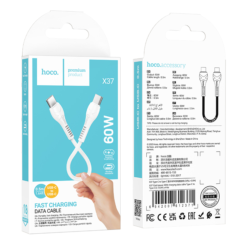 Câble de charge Hoco X37 C vers C 60W : le choix parfait pour une charge rapide et sûre