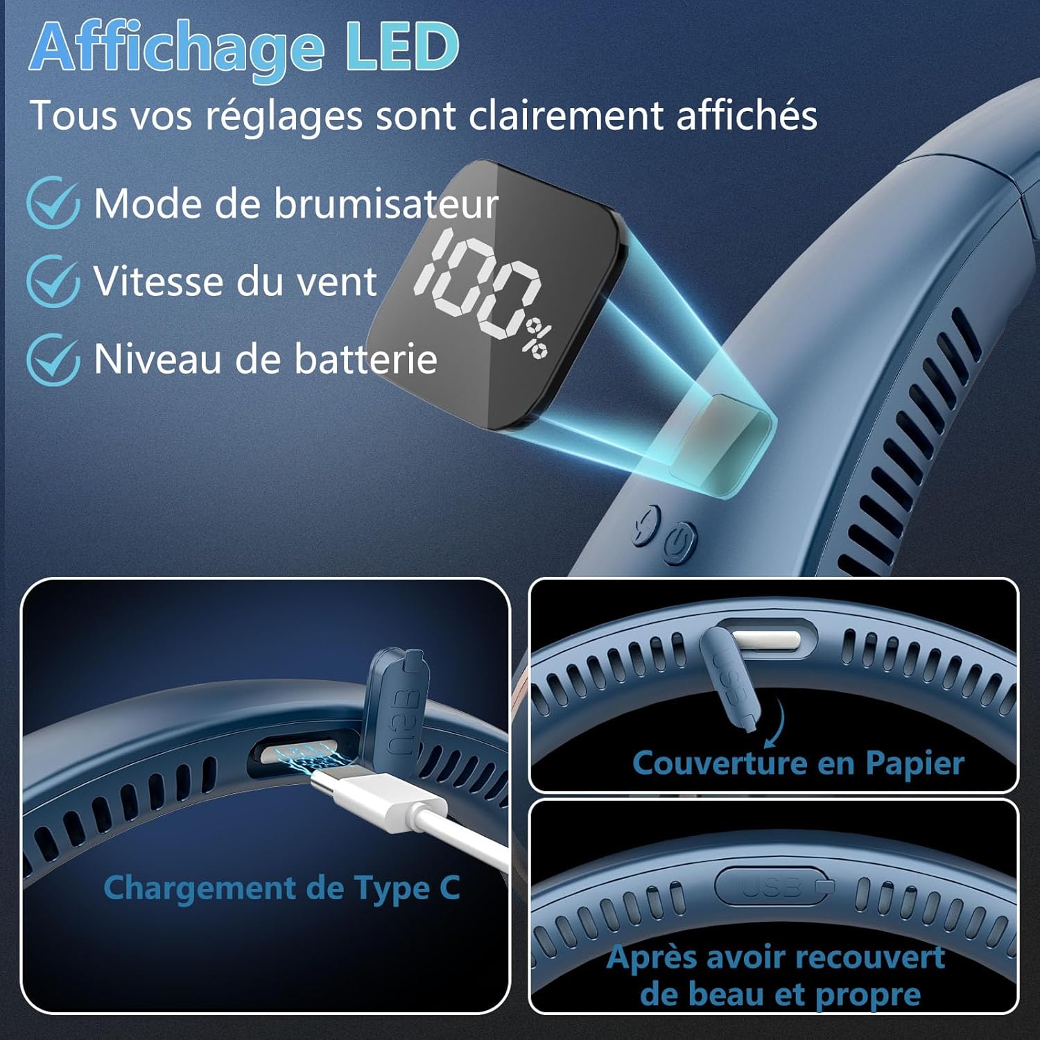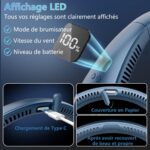 • Écran numérique et batterie longue durée : ventilateur portable équipé d’un écran LED numérique, qui peut afficher la vitesse du vent, le mode pulvérisateur et l’énergie de la batterie en temps réel. Collier ventilateur cou 4000 mAh autonomie de la batterie jusqu’à 4 à 10 heures (en fonction de la vitesse du vent et du mode de pulvérisation). L’incorporation du port de charge Type-C ajoute un couvercle anti-poussière USB pour mieux protéger le port de charge
