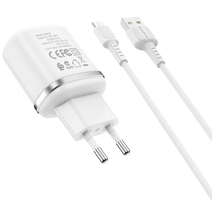 SZU 1 USB, 3A, QC3.0, avec câble micro, Borofone BA36A, blanc