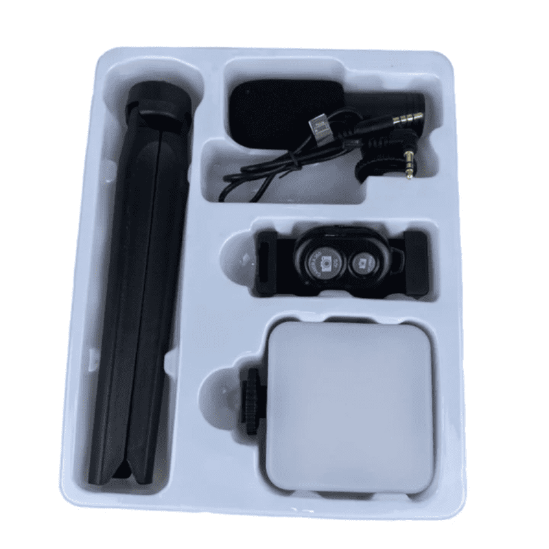 Cet AY-49C est un ensemble d’accessoires vidéo qui comprend un trépied, un microphone et une lumière. Le trépied offre stabilité et soutien à votre appareil photo ou à votre téléphone pendant l’enregistrement de vidéos. Il est réglable en hauteur et dispose de pieds pliables pour un transport facile.