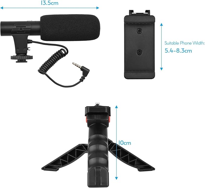 la La plage de serrage du support de téléphone est d’environ 5,4 A 8,3 cm/2,13-3,27 pouces, largement utilisé dans la plupart des smartphones. Le support supérieur de la griffe froide permet un Montage rapide du microphone et de la lumière LED.