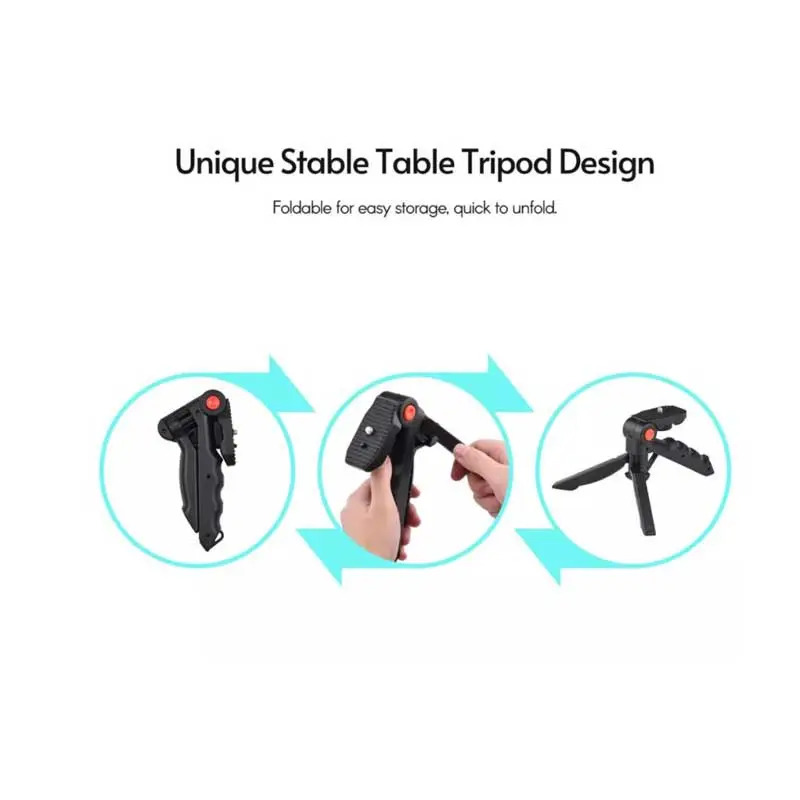 conçue Avec plaque pliante, le trépied est à double application pour la préhension réglage manuel et de table, la forme ergonomique de la conception La prise en main est plus confortable.
