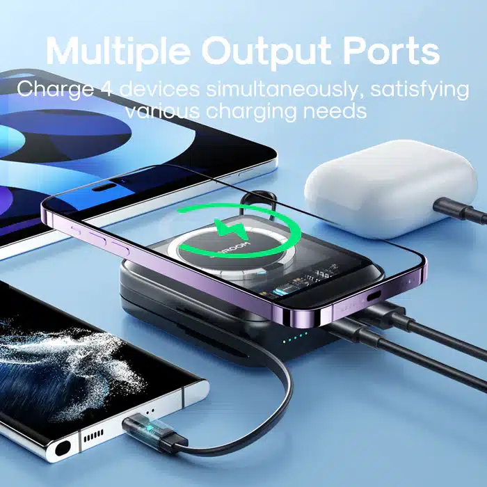 - Charge Simultanée : Capable de charger jusqu’à 4 appareils en même temps grâce à ses multiples sorties (Type-C, USB-A, Lightning et sans fil).