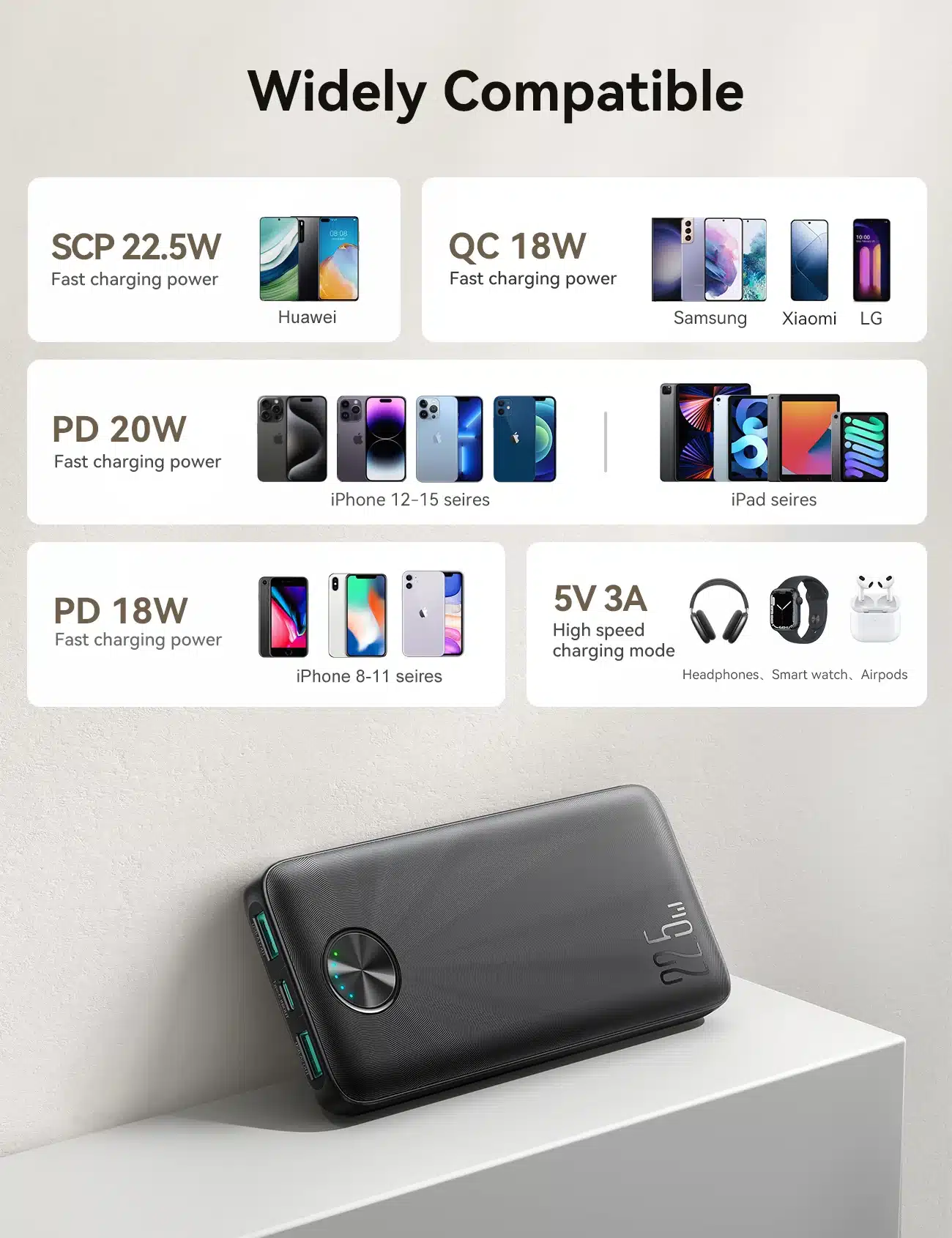 Sa capacité de 10000mAh et sa puissance de 22,5W garantissent une autonomie impressionnante. Vous pouvez recharger vos appareils plusieurs fois, même en déplacement. Elle est donc parfaite pour un usage quotidien.