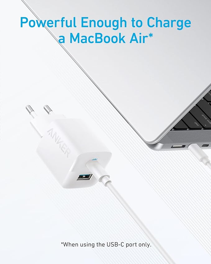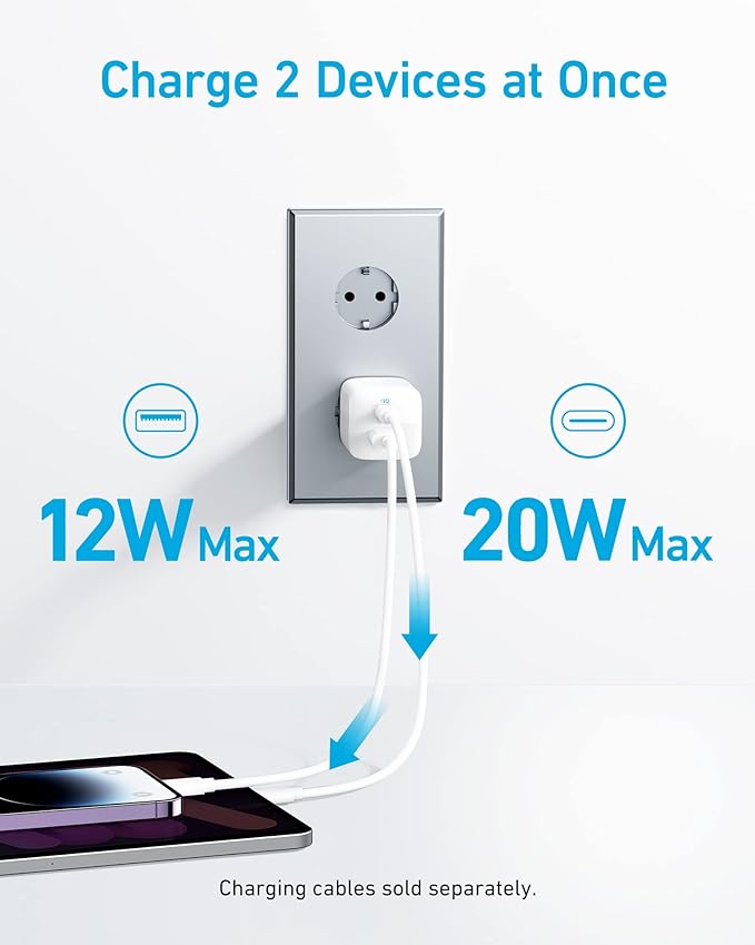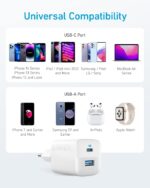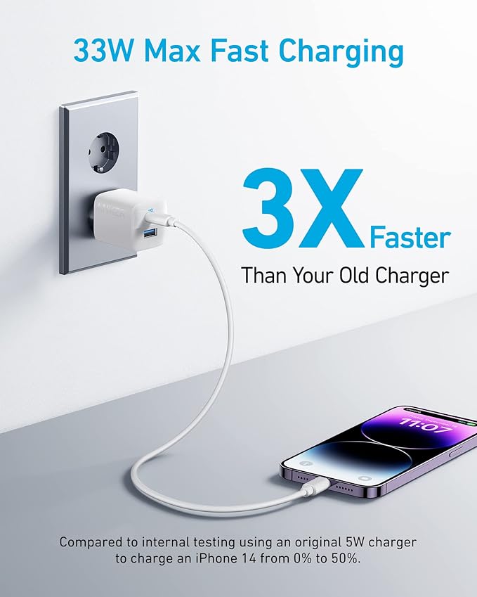 Anker Chargeur iPhone USB-C 323 (33W), Chargeur Rapide à 2 Ports USB A et USB C, Compact, pour iPhone 16/16 Plus/16 Pro Max/15/14/13, Pixel, Galaxy, iPad/iPad Mini et Plus (câble Non Inclus) Blanc